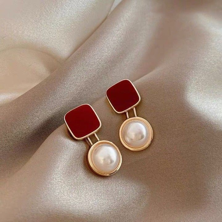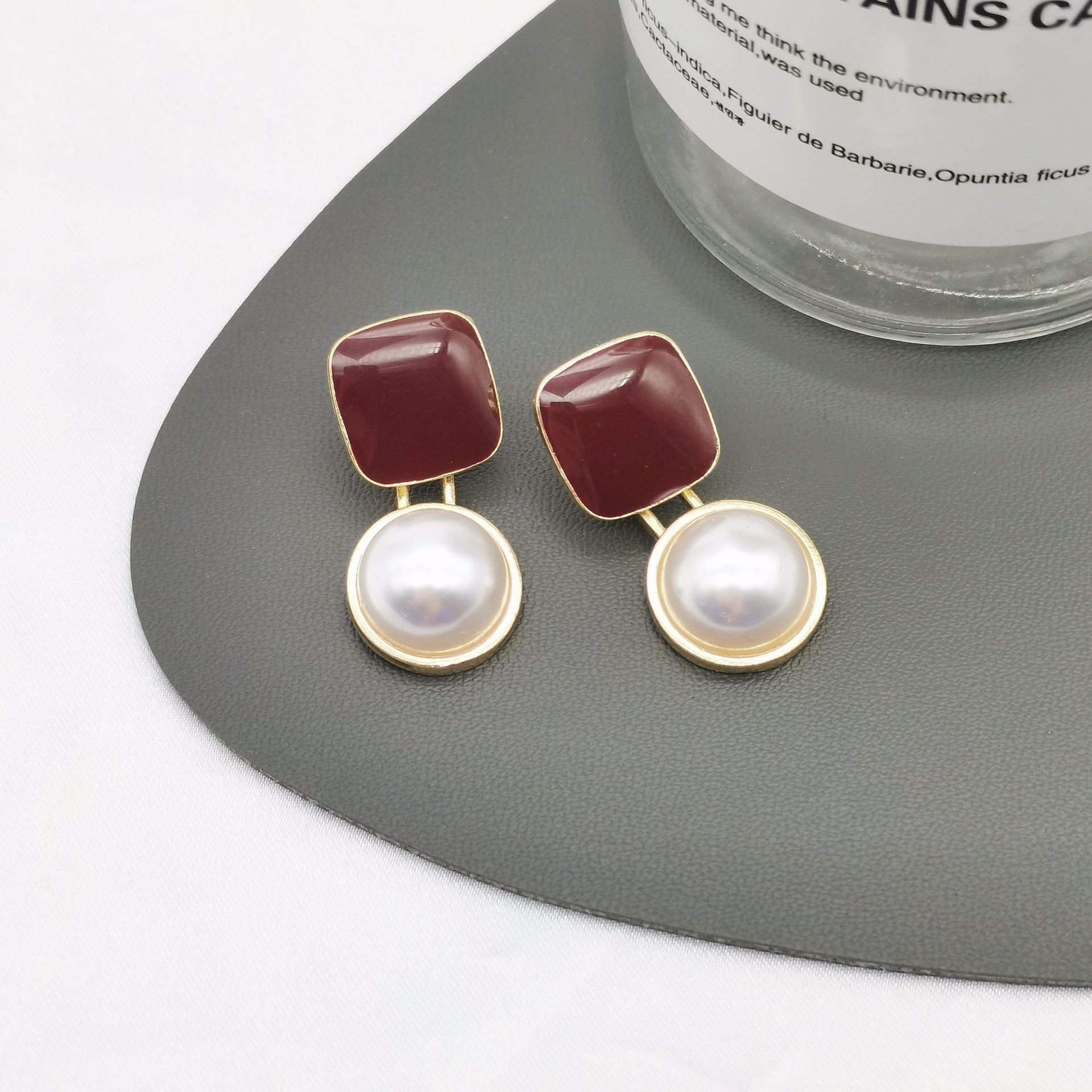 Red Blue Blocks Pearl Stud Earrings Ins French Simplicity
