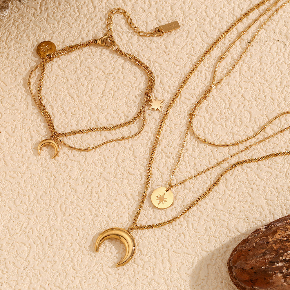 Color: Moon eight Awn star M Word star three-layer Crescent bracelet suit-gold, Moon eight Awn star M Word star three-layer Crescent necklace suit-Gold